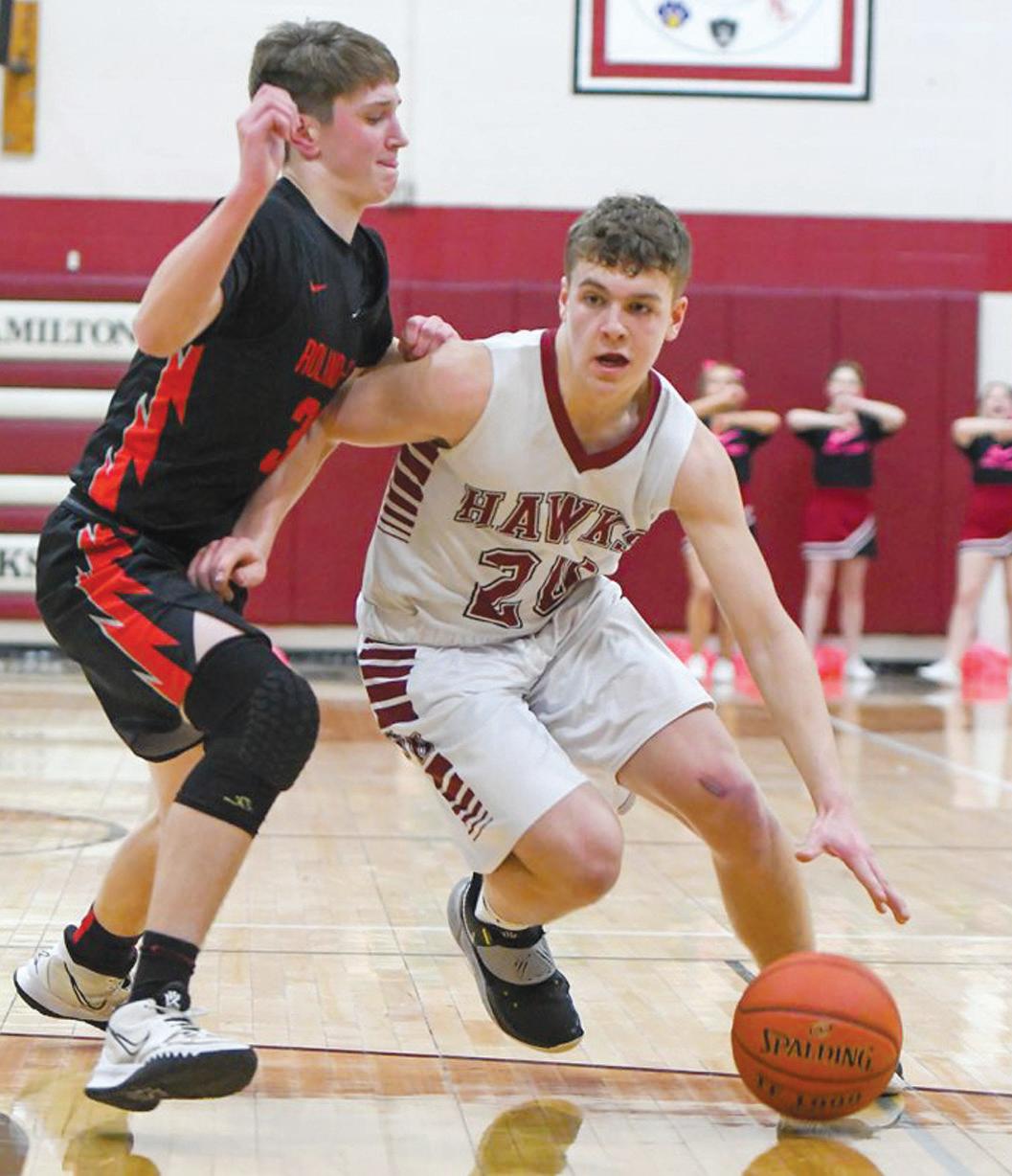 SOUTH HAMILTON’S LANDEN SKARTVEDT drives to the basket against Roland-Story last season. (DFJ file photo) CARTER BALVANZ shoots last season for the Hawks. (DFJ file photo)