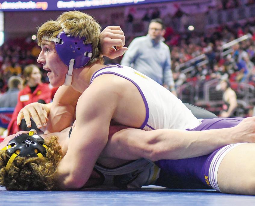SOUTH HAMILTON’S KEATON REMSBURG looks for a takedown during the 2021 state wrestling tournament.