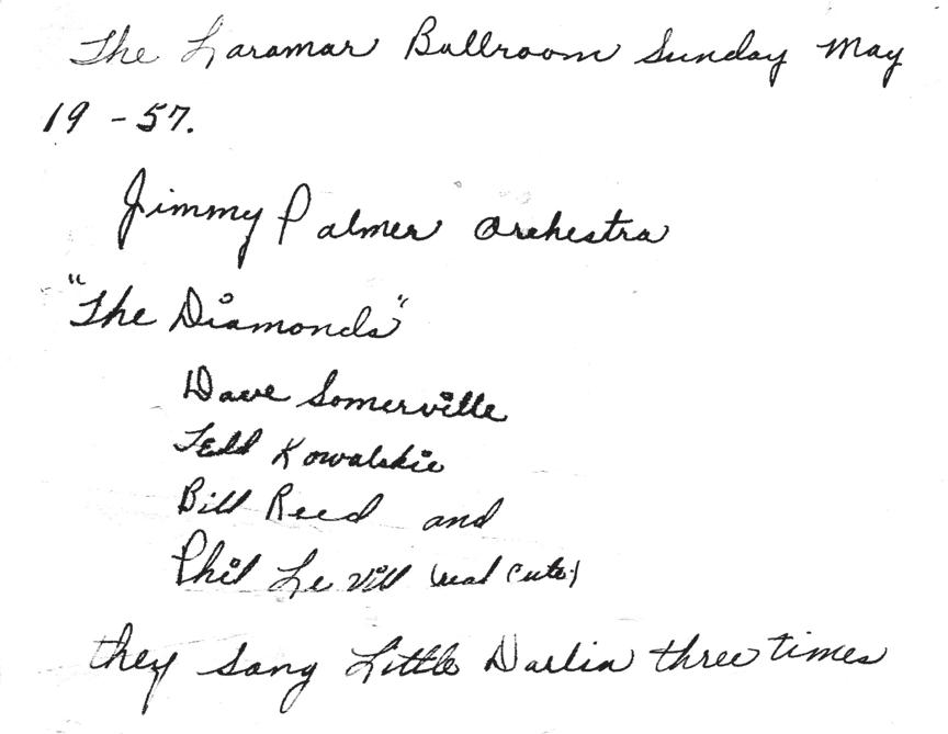 I’ll be writing more about some of those shows and the incredible collectibles Betty had saved. This will be fun.This time it is about a spring show on May 19th at the Laramar, dating back to 1957. Don’t forget the Buddy Holly and the Winter Dance Party show would play at the Laramar just some twenty months later. This show was when Toronto, Canada’s the Diamonds came to sing for the first of two sets that they would do at our Laramar that night.