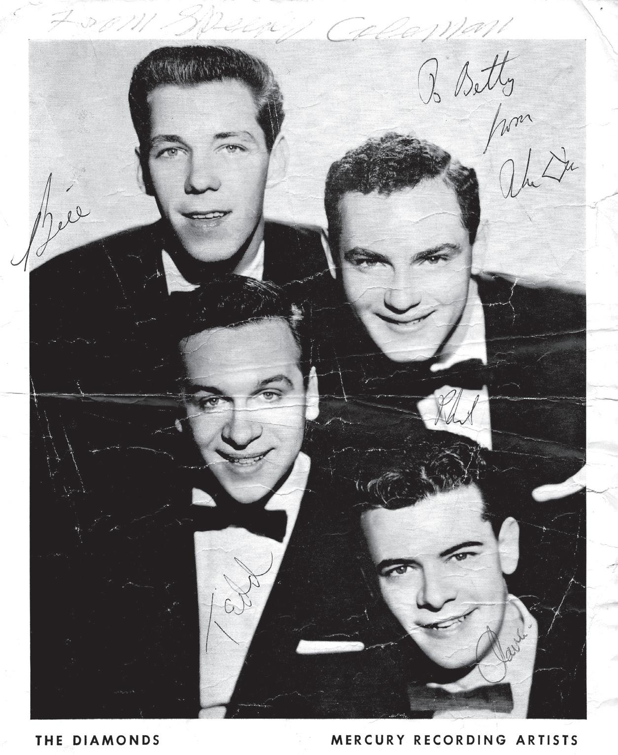 The Diamonds would get their start in 1953, when a young sound engineer for the Canadian Broadcasting Corp, David Somerville, met three other friends from Toronto to start a singing group based upon all of their strong vocal capabilities. Those three included Phil Levitt, who Betty noted in her notes as the “cute one,” Bill Reed and Ted Kowalski.