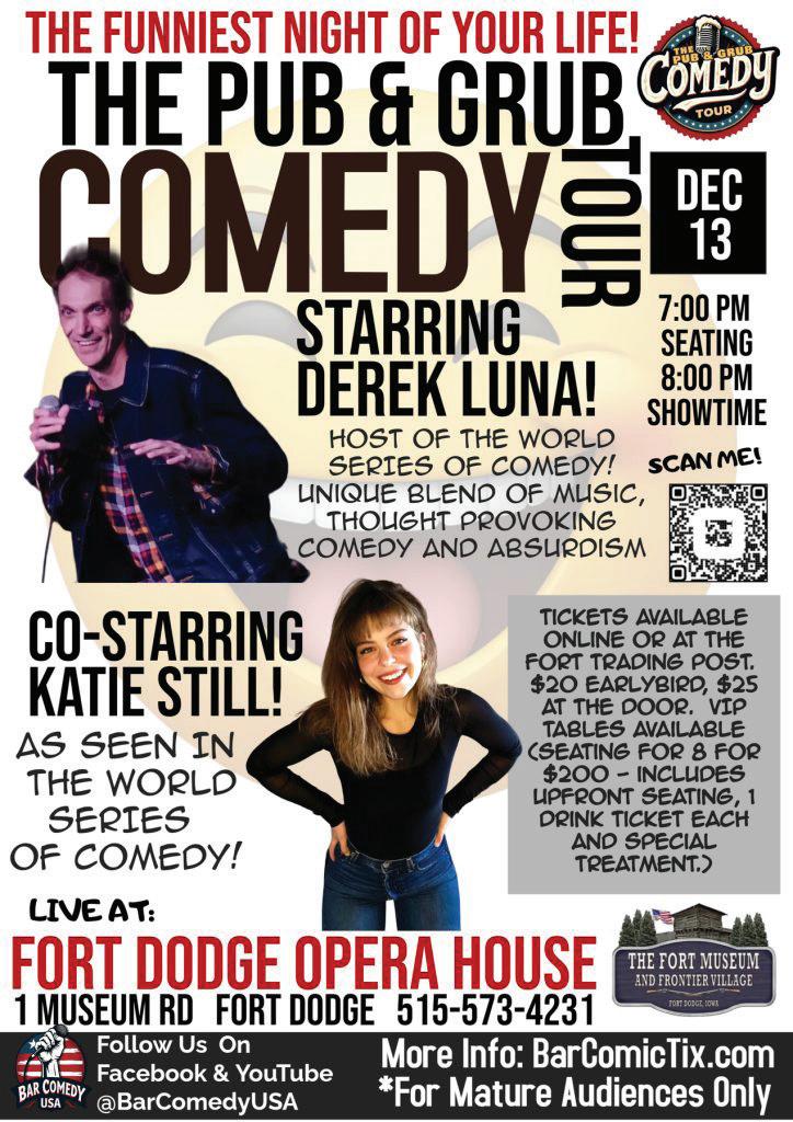 The Pub N’ Grub Comedy Tour will make its third stop at the Opera House. The show begins at 8 p.m., with doors opening at 7 p.m. Tickets are $20 online (fortmuseumfv.com) or for $25 at the door. Museum Executive Director Deb Davis said that VIP tables are available for $200. Those tables seat eight people. They include a free drink and servers at their location during the evening.