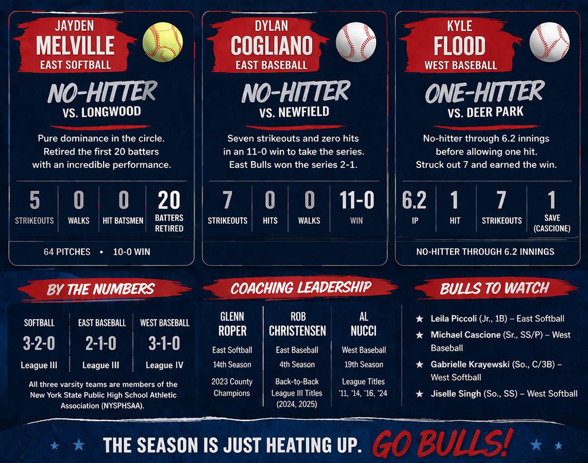 Newsday named their top-100 baseball and softball players prior to the season, and some Bulls made the list. Leila Piccoli, a Jr. first baseman for East, Michael Cascione, a Senior shortstop and pitcher for West, Gabrielle Krayewski, Sophomore catcher and third baseman for West, and Jiselle Singh, a Sophomore shortstop for West, all made the list the top-100 list in their respective sport.