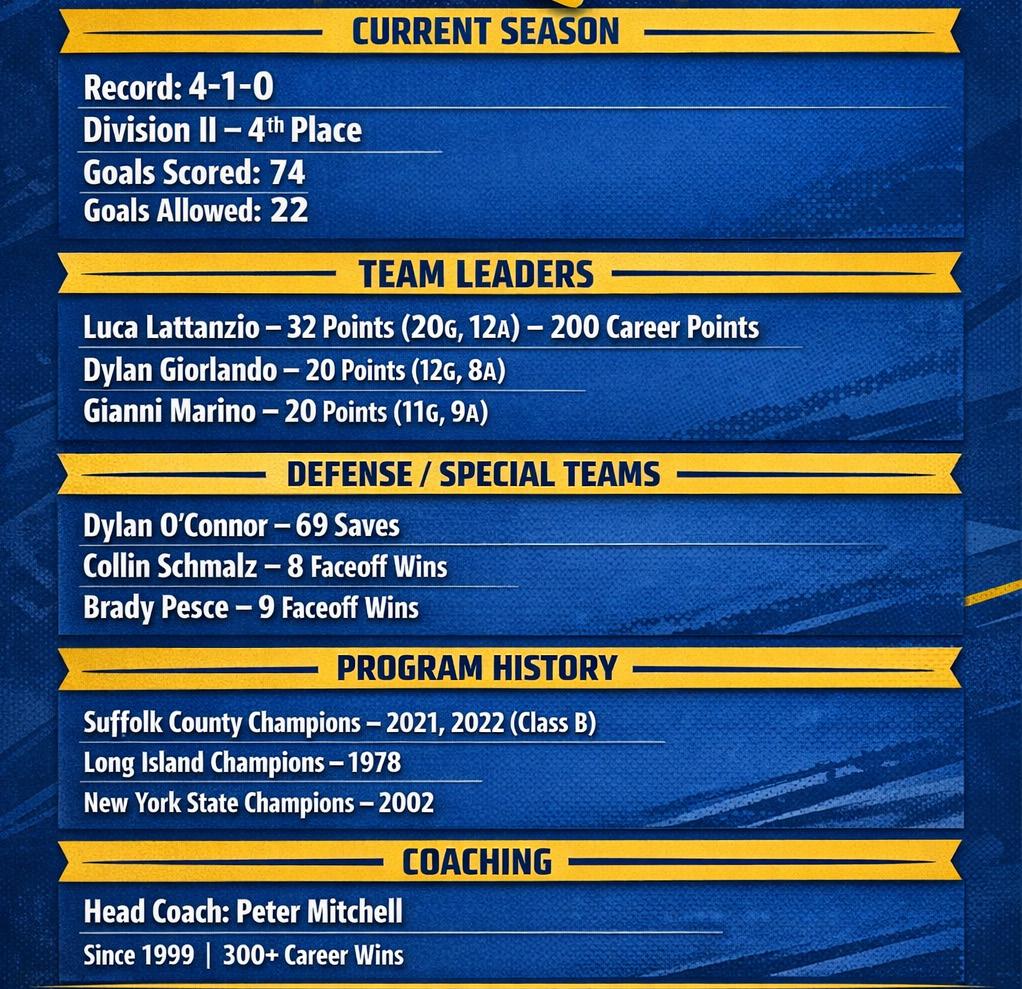 Currently, the Spartans boast a 4-10 record, placing them in fourth in the Division II standings. Comsewogue has fared well through five games, losing only one. The loss came against a Nassau opponent in Wantagh, where they were routed 22-14. Other than that, the Spartans have remained strong on defense, allowing 22 goals and keeping their opponents to
