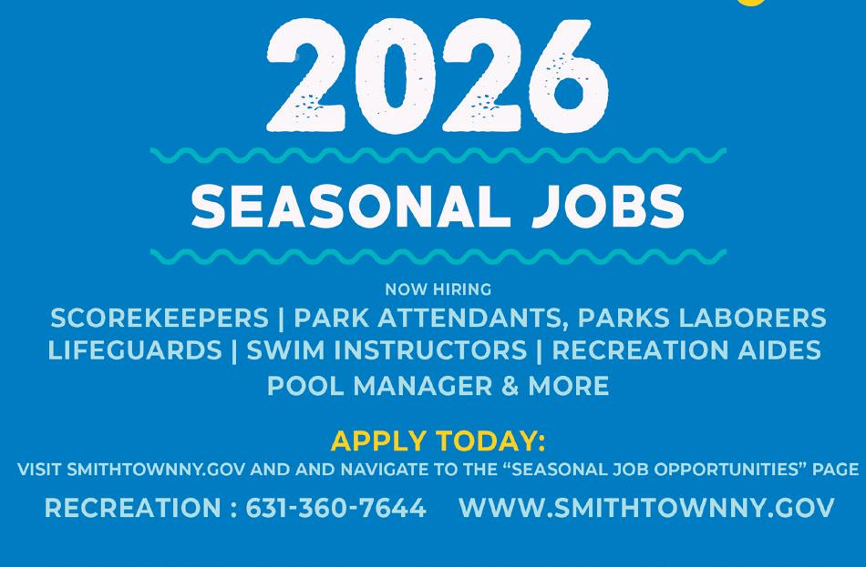 For a full list of currently available positions, visit the Town of Smithtown Website at SmithtownNY. gov/514/Seasonal-Job-Opportunities