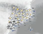S’espera precipitació feble a l’extrem sud del litoral. A més, a partir de migdia s’esperen alguns ruixats dispersos a l’interior, principalment en àrees de muntanya. Seran d’intensitat feble, localment moderada, i acumularan quantitats minses, localment poc abundants. Localment els ruixats podran anar acompanyats de tempesta i no es descarta calamarsa. La cota de neu se situarà entorn dels 1.500 metres.