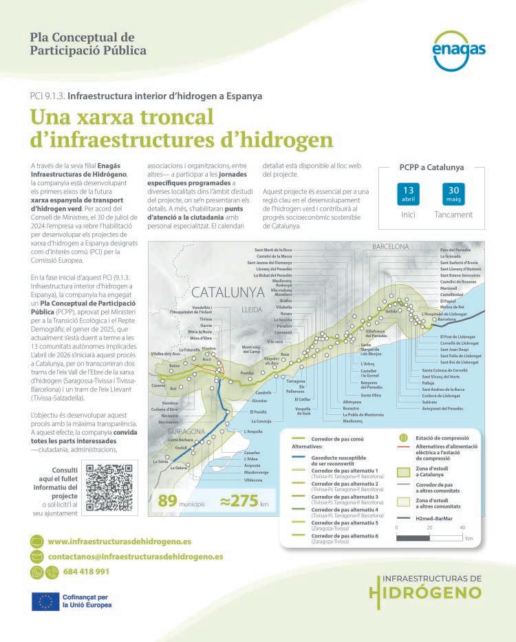 La companyia Enagas obre el període de dos mesos del procés participatiu del projecte del corredor d’hidrogen verd europeu que arribarà fins a Barcelona, amb una inversió total de 3.310 milions d’euros