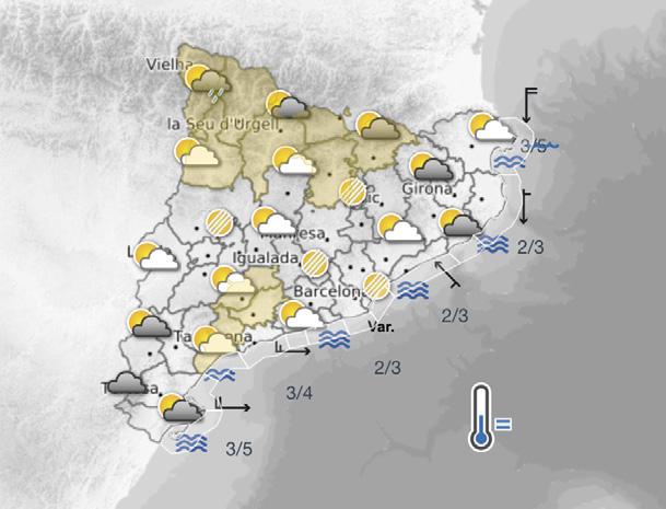La temperatura mínima serà similar, o de forma puntual lleugerament més alta. En el cas de la màxima, serà similar en general, tot i que al quadrant nord-est baixarà lleugerament.