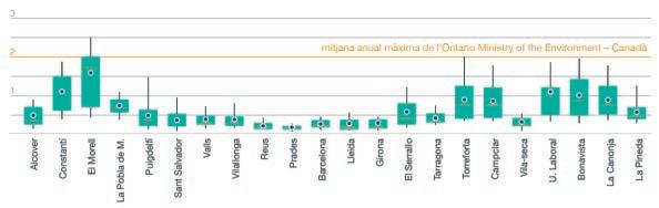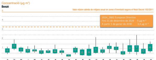 concentracions registrades se situen per sota del límit normatiu actual de 5 micrograms per metre cúbic, i fins i tot per sota del nou límit de 3,4 que la nova directiva europea establirà a partir del 2030.