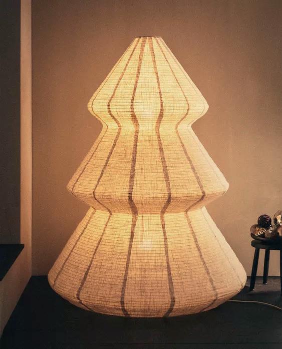 Llum decorativa amb forma d’arbre i pantalla de lli teixit en to beix clar, ideal per crear una atmosfera càlida i elegant durant les festes. L’estructura i la base de metall blanc garanteixen estabilitat, mentre que les tres potes fines eleven lleugerament la peça. Disponible també en 94 cm i 46 cm. Preu total: 349 euros.