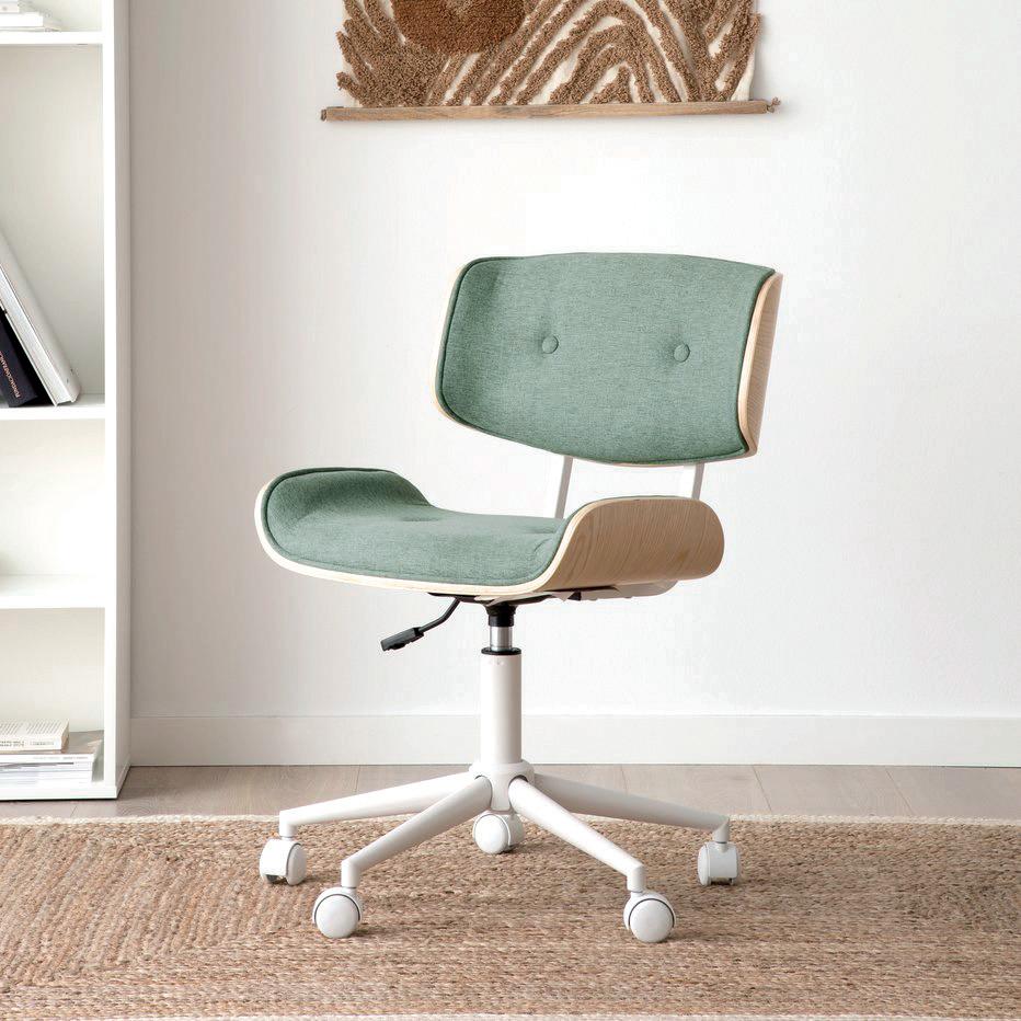 Cadira d’escriptori amb seient entapissat i estructura de fusta, pensada per combinar comoditat i disseny. Disposa de rodes per facilitar el moviment i un respatller ample que afavoreix una postura confortable durant l’estudi o la feina. Disponible en verd o beix, és una opció funcional i elegant per a espais de treball actuals. Preu: 149 euros.
