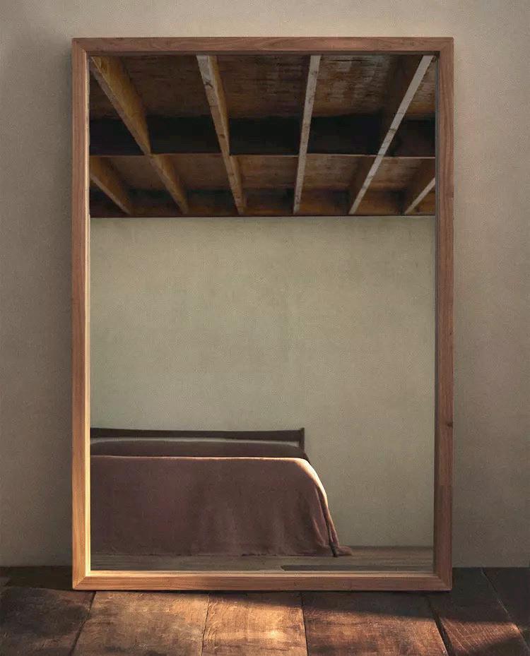 Mirall de peu fabricat amb fusta d’olm, pensat per aportar calidesa i funcionalitat a qualsevol estada o vestidor. El seu format gran permet una visió completa i el converteix en una peça decorativa amb presència. Disponible també en versió 160 × 50 cm. A causa del seu volum, té despeses de tramesa especials. A Zara Home. Preu total: 249 euros.