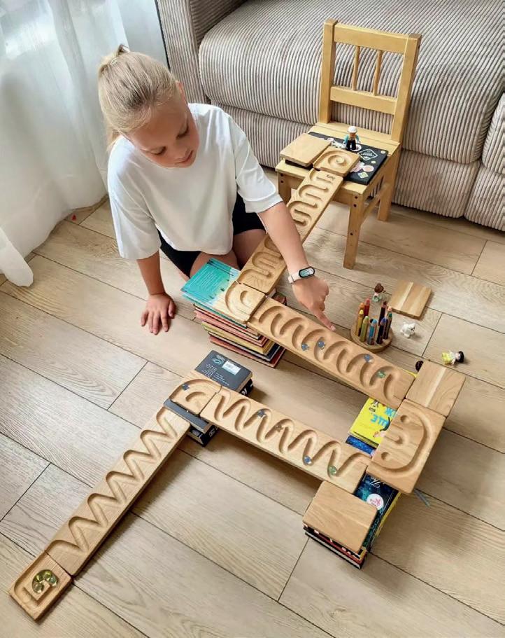 Pista de bales de fusta artesanal, amb recorregut sinuós que convida al joc creatiu i a l’experimentació. Un regal ideal per a infants, que afavoreix la coordinació, la paciència i la curiositat a través del moviment de les bales. Disponible a threewoodShop. Des de 54,23 euros.