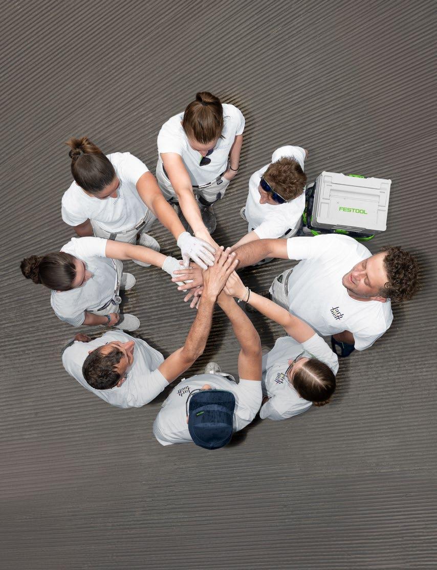 Dus als u ook op het gebied van gereedschap op teamwork wilt vertrouwen, bent u bij Festool prima uitgerust. Er zijn geen uitgebreide teambuildingmaatregelen nodig om alle betrokkenen samen te laten werken. Want de machines, accessoires en verbruiksmaterialen zijn al perfect op elkaar afgestemd. Teambuilding betekent in ons geval: hoe intensiever u het systeem gebruikt, hoe moeitelozer, nauwkeuriger en efficiënter u het gewenste resultaat bereikt. Was alles in het ambacht maar zo eenvoudig …