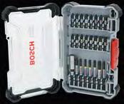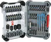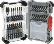 Bits 25 mm: PH1; PH2(3x); PH3; PZ2(2x); PZ3; T15; T20(2x); T25(2x); T30(2x); T40 Bits 55 mm: PH2(2x); PZ2(2x); T20; T25; T30 Bits 65 mm: PH1/ PH2; PH2/PH3; PH2/PZ2(2x); T15/T20(2x); T25/ T30; SL1x5.5/SL1x5.5 Dop 50 mm: 8; 10; 13 mm, Standaard bithouder; Snelwisselbithouder