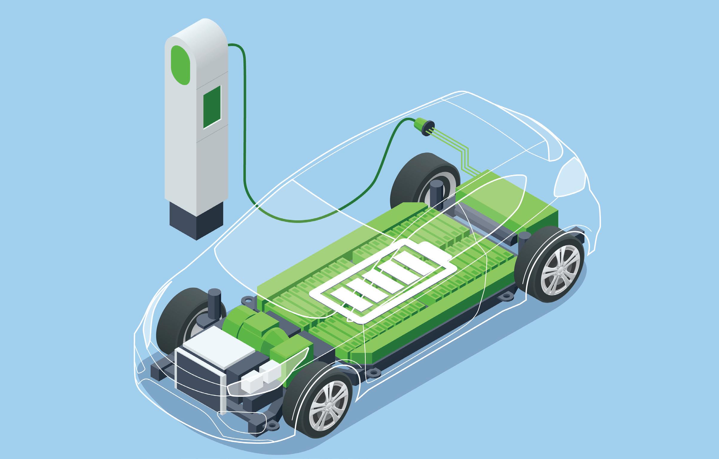 the lithium ions. These ions are created at one electrode, the anode, by taking electrons from lithium atoms. They then flow through a liquid electrolyte to the second electrode, the cathode. At the same time, the electrons move toward the cathode along an external circuit, which powers the EV’s motor. Ions and electrons find themselves at the cathode and stay there until the battery is plugged into a recharger, and the process is reversed.