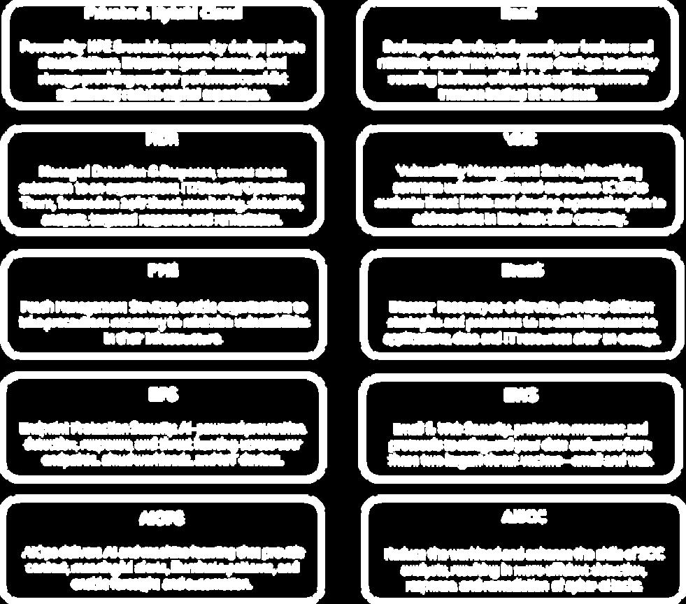 AdvancedsecurityservicessuchasManagedand ExtendedDetectionandResponse24/7(MDR/XDR). Applicationvulnerabilitymanagement(VMS). Advancedendpointdetectionandresponsetools (EPS).DisasterRecoveryandBackupasaservice (DraaS)toprotectagainstransomwareattacksand naturaldisasters.AdvancedAIOPSservicewrapthat deliversAIandmachinelearningtoprovidecontext, insights,alerts, anomalies,andresponseautomation.