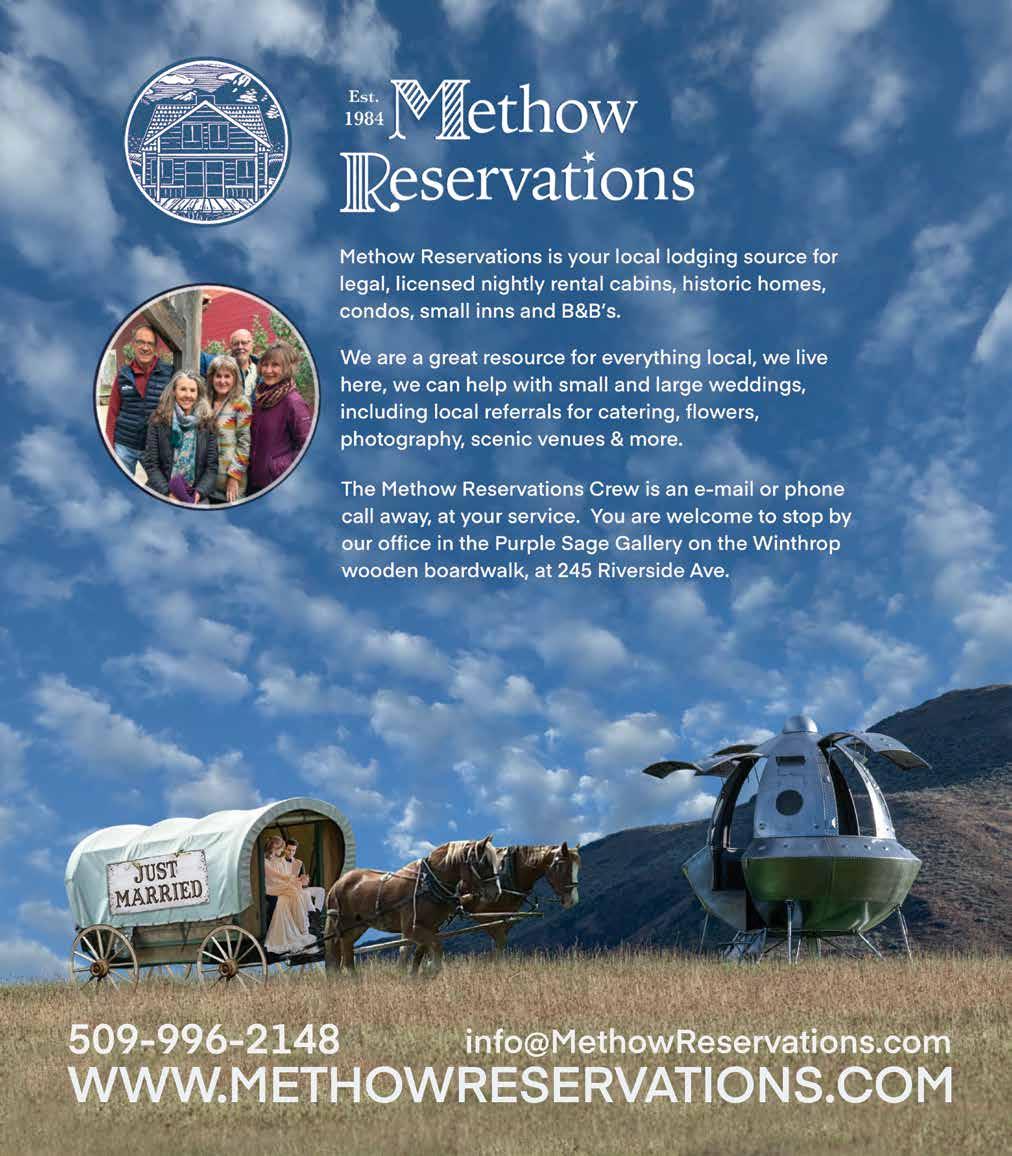 • Skalitude Retreat, facebook. com/Skalitude. A refuge in the wilds off Libby Creek in the lower Methow Valley, Skalitude is a pollinator sanctuary and eco-retreat. It’s a private getaway with a wide-open meadow, surrounded by woods and hills at the end of a long dirt road. Access is reasonably easy, but there are no other facilities nearby. Indoor lodging is no longer available; contact the owners to inquire about outdoor weddings, and the possibility of camping and using the 2,000-square-foot Sky Lodge and other amenities.