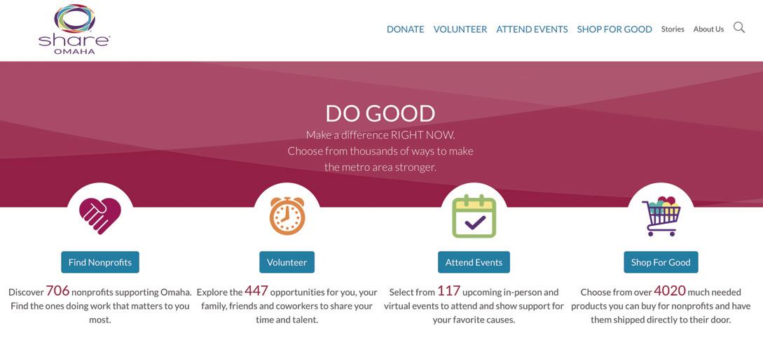 THOUSANDS OF GIVERS THROUGHOUT the Omaha metro have bookmarked SHAREomaha.org as their home for connecting with 700-plus nonprofits. SHARE Omaha was created by local philanthropists to help area nonprofits fulfill their missions by connecting donors to share money, material goods and time. SHARE Omaha does not charge any fees to nonprofits and does not keep any portion of what is donated. The SHARE Omaha platform is available 365 days a year so everyone can do good every day.