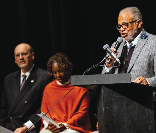 Pastor CJ Rhodes of Mt. Helm Baptist Church offered a prayer from the stage for Jackson’s Beth Israel Congregation, still reeling after an arsonist destroyed most of the library and synagogue the weekend