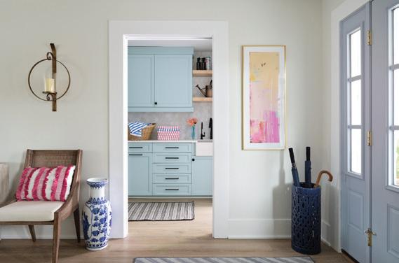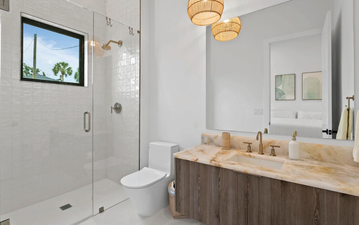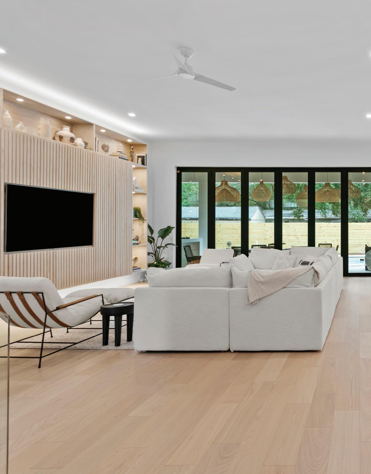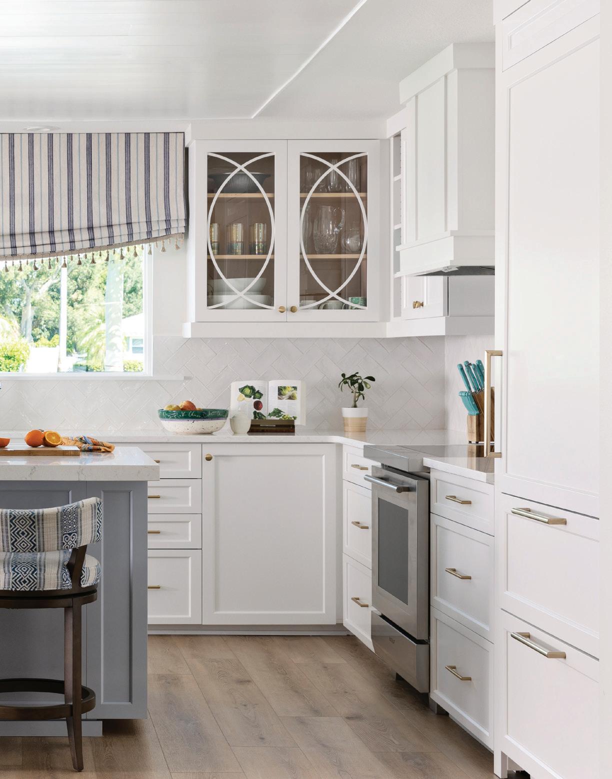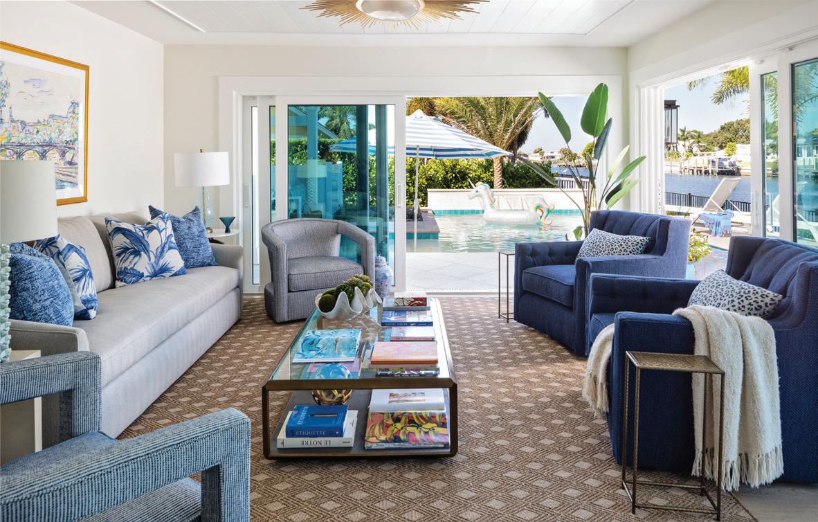 Recognizing the home’s prime waterfront location, Potthast worked to seamlessly integrate indoor and outdoor living areas into the design. “The family are avid boaters and anglers and planned to spend a great deal of time in the outdoor space,” she says. “Special features in the exterior design included the tabby shell stucco on the outdoor fireplace and the umbrella anchored into the sun shelf.” M