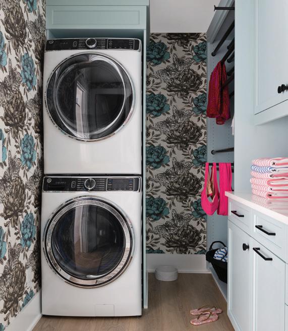 While no-one really loves to do laundry, Potthast decided to make the room pop with color. The laundry room, typically a utilitarian space, was designed with bright cabinets and a shimmery, colorful, floral and butterfly wallpaper.
