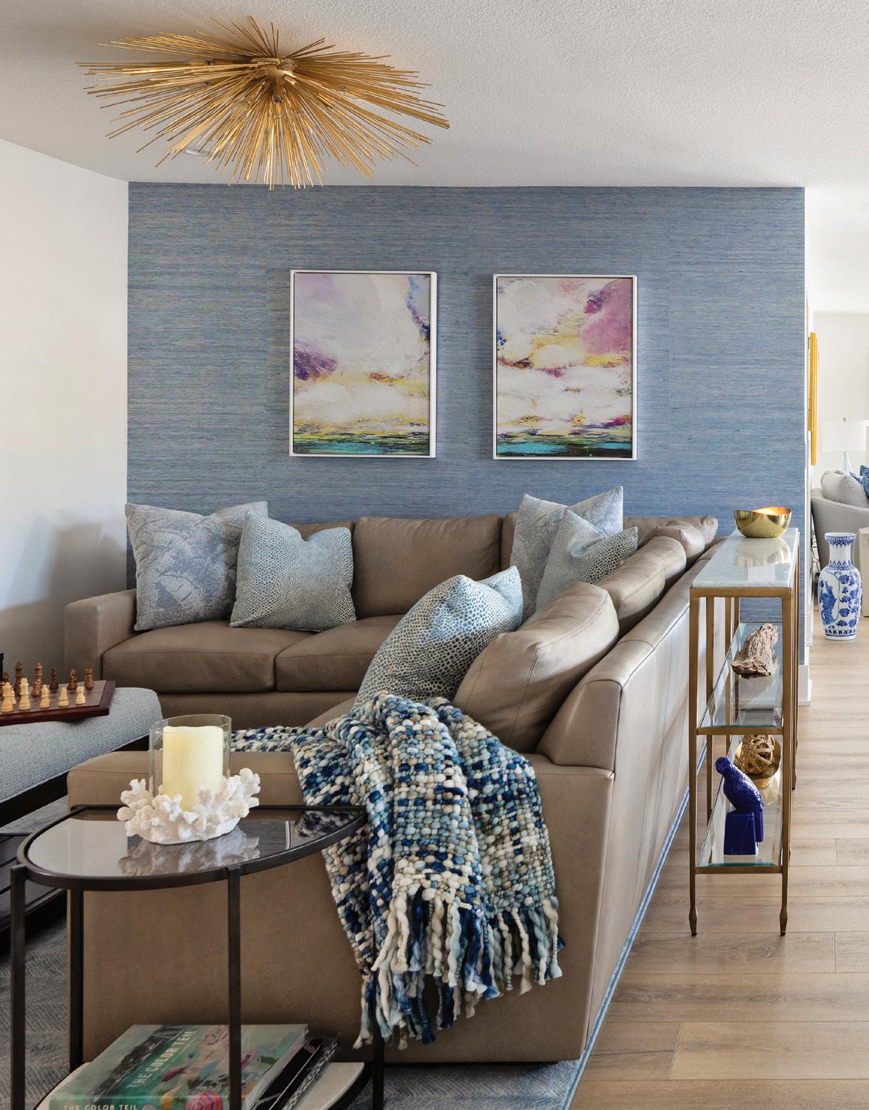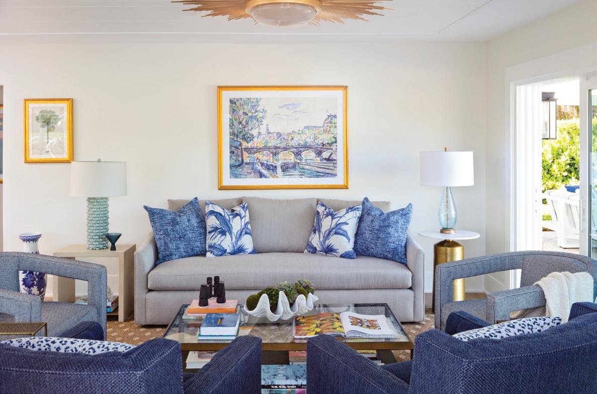The light blue kitchen island was the touch point for many of the fabric selections. Variations of blue, aqua, white, and navy were used in the main living areas. Floral and palm motifs were repeated in artwork and in pillow fabric selections. The “jewelry of the home,” as Potthast sees it, “were the gilded light fixtures.” Much of the plumbing fixtures and cabinet hardware were chosen in complementary gold finishes to elevate the design.