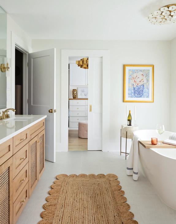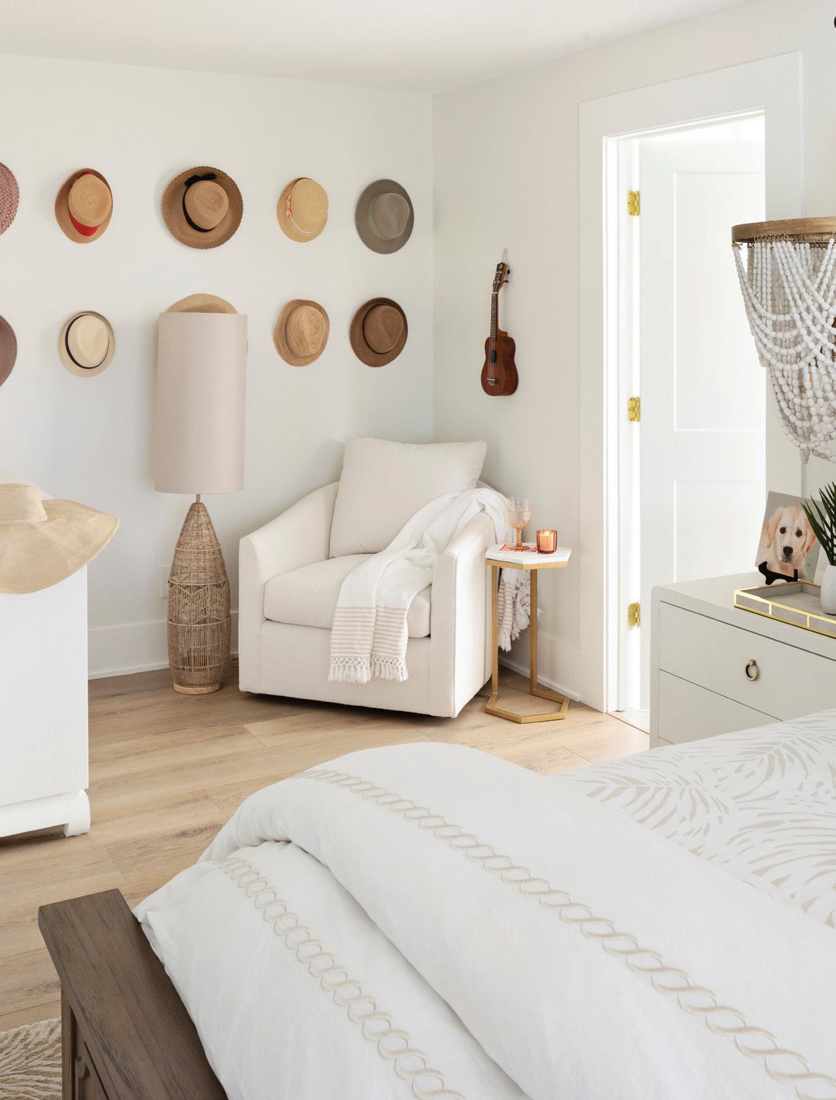 In the primary bedroom and bath, the colors and materials provided a more neutral base. In the primary bath, handtied cane highlight the inset panels. The primary bedroom design also took a moment away from the color, featuring a swivel chair in a luxurious ivory fabric, soft white nightstands and dresser, and white beaded bedside pendants.