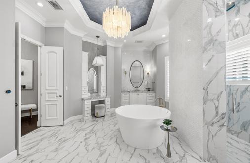 “For the owner’s suite, we wanted to create the feeling of a spa,” said Rose. “The stunning marble floors, double vanities, and freestanding tub invite the homeowners to relax and truly unwind.”