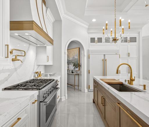 One island base features a warm, earthy brown finish that ties seamlessly into the home’s separate bar area, adding depth and contrast to the otherwise light palette. Gold hardware throughout the cabinetry adds warmth and polish, while a double lucite and gold chandelier suspended above the island introduces a glamorous focal point.
