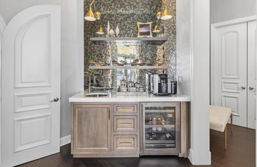 One of the home’s most appealing features is the primary suite located on the first floor. Double entry doors offer privacy, opening to a serene retreat designed for relaxation. A morning bar adds a luxurious touch, complete with a sink, refrigerator, and space for an espresso machine—perfect for starting the day without leaving the suite. Silvery wallpaper and floating shelves complete the stylish nook.