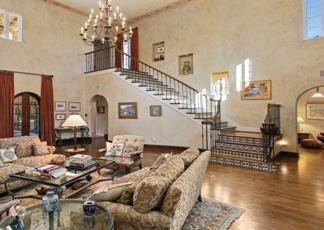 Beyond wrought-iron gates, guests are welcomed into a dramatic two-story living room where soaring ceilings, graceful archways and abundant natural light create an unforgettable first impression. A fireplace with a stately mantel anchors the space, adding warmth and classic character.