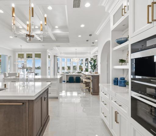At the heart of the home is the crisp white kitchen, designed as both a functional workspace and an elegant gathering place. Marble floors reflect natural light throughout the room, creating a bright and serene atmosphere. The custom kitchen design extends from floor to tray ceiling, offering abundant storage and incorporating dual islands that serve as preparation space as well as seating for family and guests.