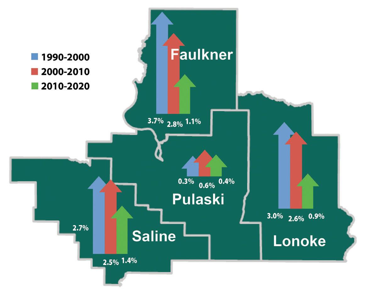 As the chart at right shows, all the region’s counties—even Saline—grew more slowly in the more recent decade. The biggest question concerns the growth rate of Pulaski County, which appears to have grown slightly faster 2010–2020 than it did in the 1990–2000 interval, but slower than the 2000–2010 decade. In the big picture, the most dramatic story is the slowdown evident in Faulkner and Lonoke Counties, both of which saw their annual rate of growth decline by more than half from the previous decade.