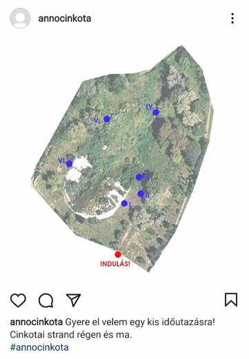 A kép tartalmazza az @annocinkota nevet, melyre ha rákeresünk egy ins tagram oldalra vezet minket- Azért választottam ezt a közösségi platformot, mert úgy gondolom, a mai fiatalokat ezen keresztül lehet a leginkább elérniEzen az oldalon látunk hat képet és egy térképet- A térkép a kiindulási pon tot és a hat másik pontot tartalmazza egy útvonallal összekötve, mint egy időutazó tanösvény-