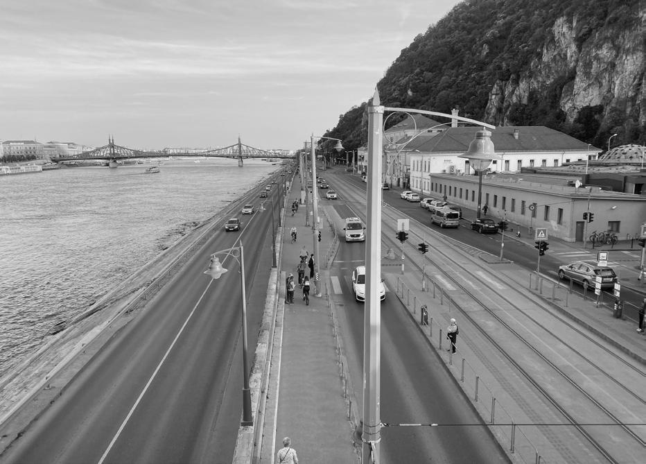 Habár tényleg vannak olyan szakaszok, ahol megvan a kellő szélesség a négysávos közlekedésre, akadnak olyan részei is a budai rakpartnak, ahol szinte két gyalogos se fér el egymás mellet - Specifikusan választottam a projektem helyszínének a budai rakpart legszűkebb szakaszát, a Rudas gyógyfürdő villamosmegállója előtti részt - Alapul vettem a kerékpáros és