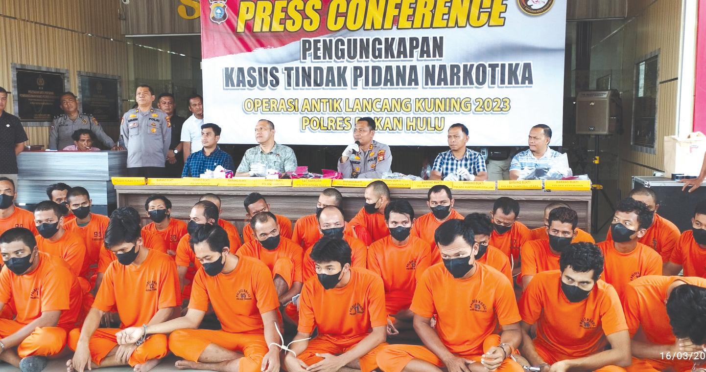 Priyo Soegito SIK mengatakan, pihaknya menangkap 43 tersangka penyalahgunaan narkotika pada Operasi Anti Narkotika (Antik) Lancang Kuning (LK) Tahun 2023. Hal itu disampaikan Kapolres dalam konferensi pers dengan wartawan di pintu utama Gedung Mapolres Rohul, Kamis (16/3).