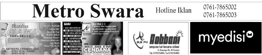 Harian Pagi THE POWER OF INNOVATION THEBESTOFSUMATERA NEWSPAPER2013 G O L D WINNERINDONESIA PRINTMEDIAAW A R D BERWAWASAN DAN BERKEPRIBADIAN METRO RIAU L ULUS V ERIFIKASI F AKTUAL Berwawasan dan Berkepribadian Diserahkan Langsung Oleh DEWAN PERS Di Harris Hotel & Conventions Surabaya, Rabu, November 2017 KAMIS, 2 FEBRUARI 2023 M 11 RAJAB 1444 H Eceran: Rp6.000.- per eksemplar Luar Kota + Ongkos Kirim