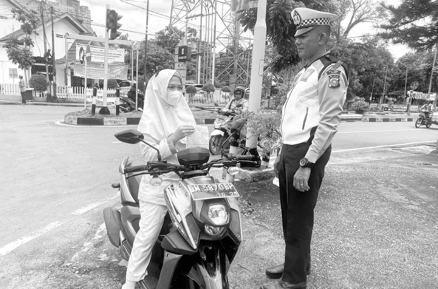 da motor dan mobil diberi peringatan secara humanis, karena tidak menggunakan helm standar SNI dan tidak memasang safety bell bagi sopir mobil.