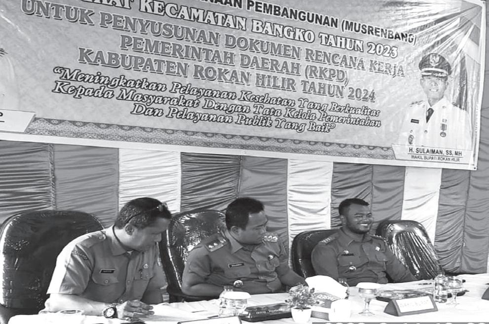 BUKA MUSRENBANG - Wabup Rohil, H Sulaiman, membuka Musyawarah Perencanaan Pembangunan (Musrenbang) ditingkat Kecamatan Bangko, di aula Kantor Camat Bangko, Selasa (14/2) kemaren. (zal)
