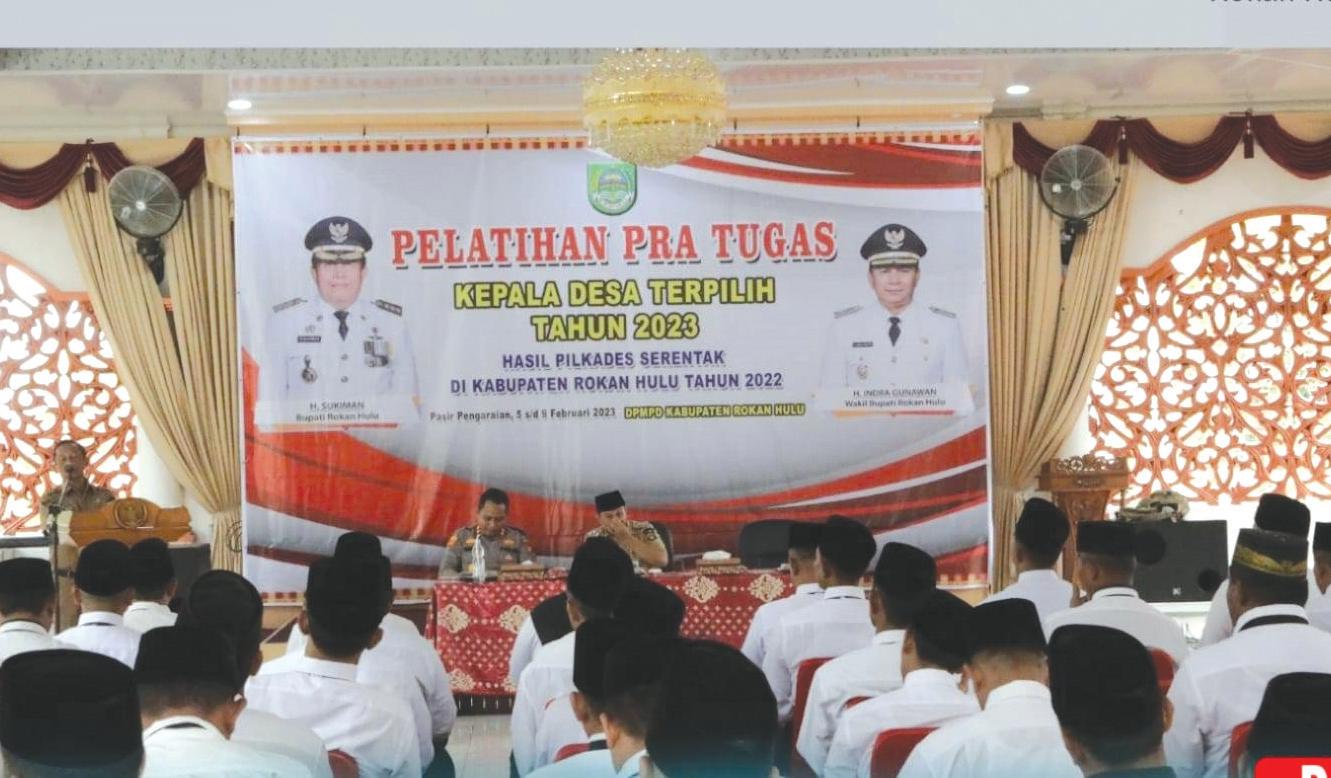 PASIR PENGARAIAN - Sebanyak 66 kepala desa (kades) terpilih pada pilkades serentak tahun 2022 lalu, telah mengikuti bimbingan teknis (bimtek) pra tugas yang ditaja oleh Pemerintah Kabupaten Rokan Hulu (Pemkab Rohul) melalui Dinas PMPD. Bimtek tersebut dibuka secara resmi oleh Wakil Bupati (Wabup) Rohul, H Indra Gunawan. Dalam sambutannya, Wabup memberikan ucapan selamat kepada para kades yang terpilih, yang sudah dipilih oleh masyarakat secara langsung. “Jabatan ini adalah satu amanah yang harus kita emban, kita di pilih oleh masyarakat, semoga nantinya para Kades yang terpilih bisa menjalankan tugasnya untuk lima tahun ke depan, sesuai aturan perundangan-