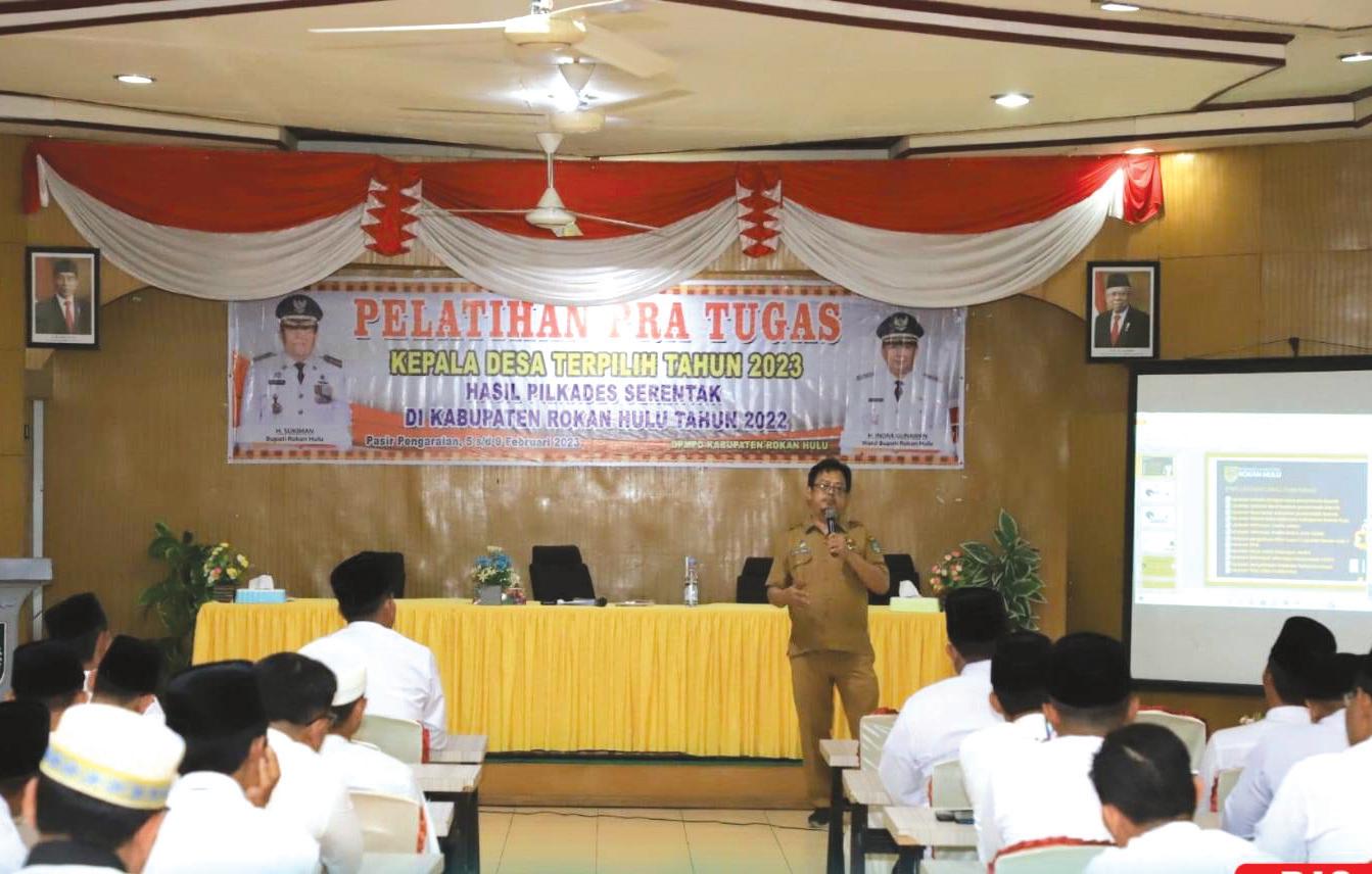 PASIR PENGARAIANBimbingan teknis (bimtek) pra tugas Kepala Desa (Kades) terpilih tahun 2023 hasil pilkada serentak tahun 2022 diadakan di Hotel Gelora Bakti Pasir Pengaraian, Senin (6/2). Kegiatan yang ditaja oleh DPMPD Rokan Hulu (Rohul) ini dilakukan sebelum pelantikan dan pengambilan sumpah jabatan kepala desa, agar kepala desa terpilih mendapatkan pembekalan sebelum menjalankan tugasnya sebagai perpanjangan tangan pemerintah untuk memberikan pelayanan terbaik di tengah tengah masyarakat.