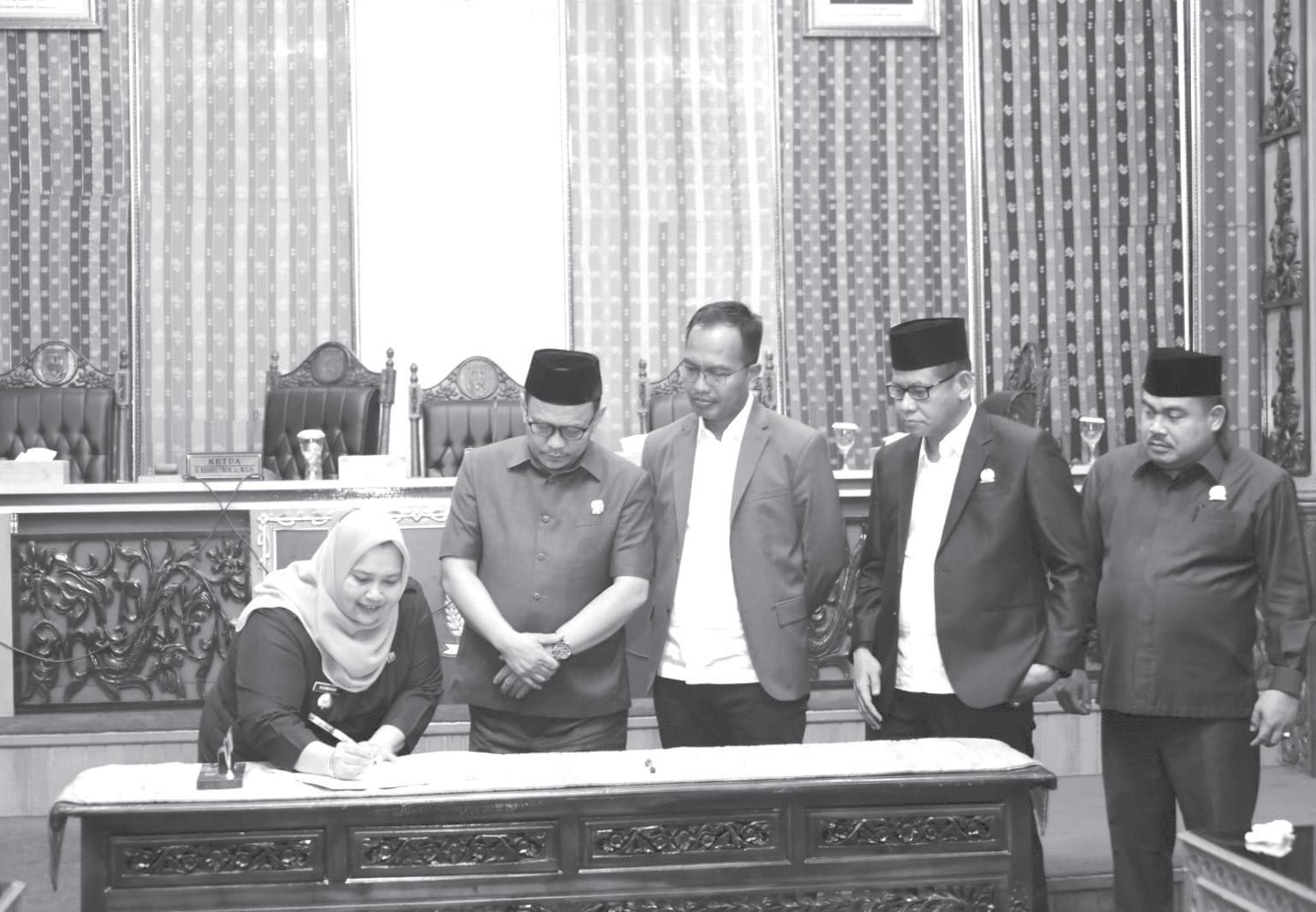 Pengesahan Ranperda RAPBD Rohul Tahun Ang garan 2023, ditandai den gan penandatanganan beri ta acara persetujuan antara Pimpinan DPRD bersama Bupati Rohul yang disaksi kan oleh puluhan Anggota DPRD Rohul.