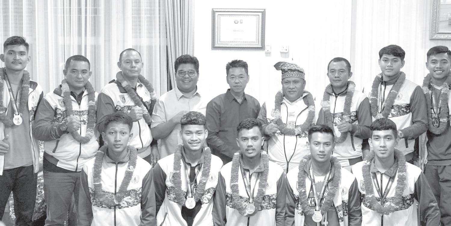 FOTO BERSAMA - Bupati Rohil, Afrizal Sintong, foto bersama dengan tim bola voli dalam acara penyambutan kepulangan atlet bola voli usai meraih medali emas di Perprov X Riau, Senin (21/11) malam. (hms)