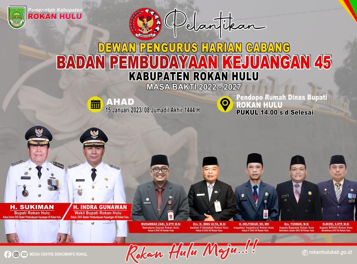 Pelantikan Pengurus DHS Badan Pembudayaan Kejuangan 45 Rohul ini sesuai dengan Surat Keputusan (SK) Nomor 210/SKEP/ VII/2022 Tentang Pengesahan Susunan Kepengurusan DHC Badan Pembudayaan Kabupaten Rokan Hulu masa Bhakti 2022-2027.