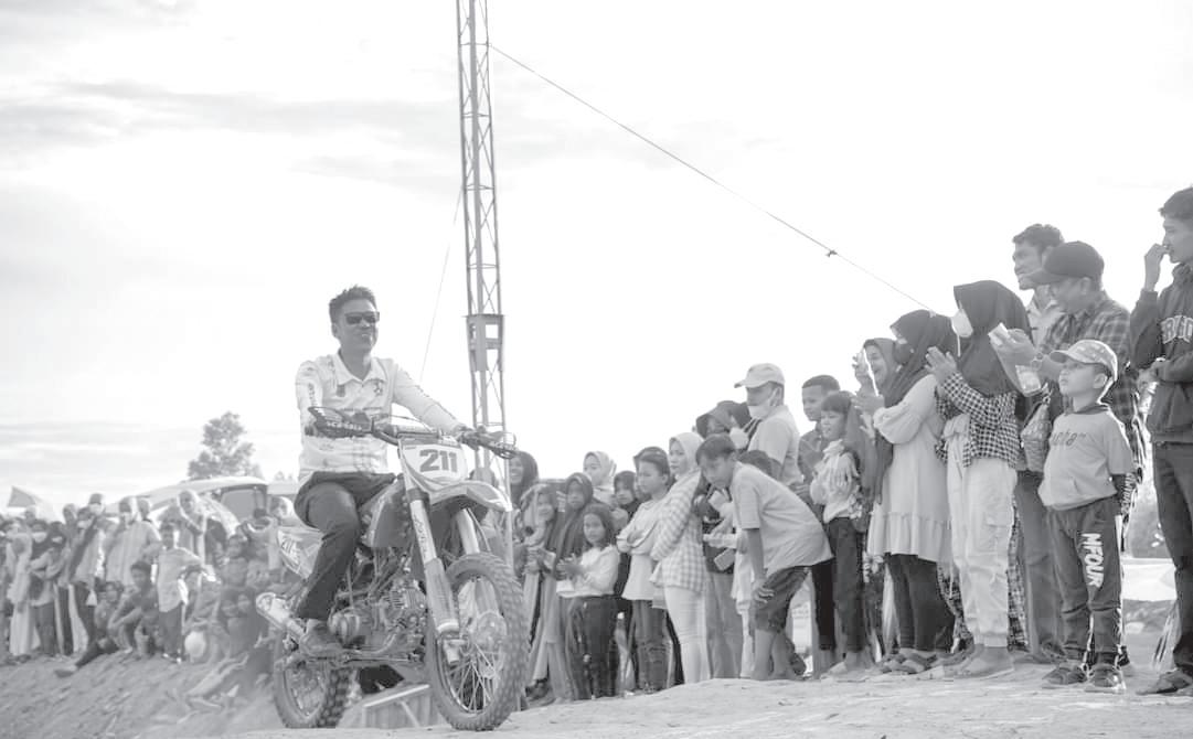 KENDARAI MOTOR - Bupati Rohil, Afrizal Sintong, mengen darai motor saat membuka kejuaraan event grasstrack, di Sirkuit Sintong Pusaka, Kecamatan Tanah Putih, Sabtu (22/10) pekan kemaren. (ist)