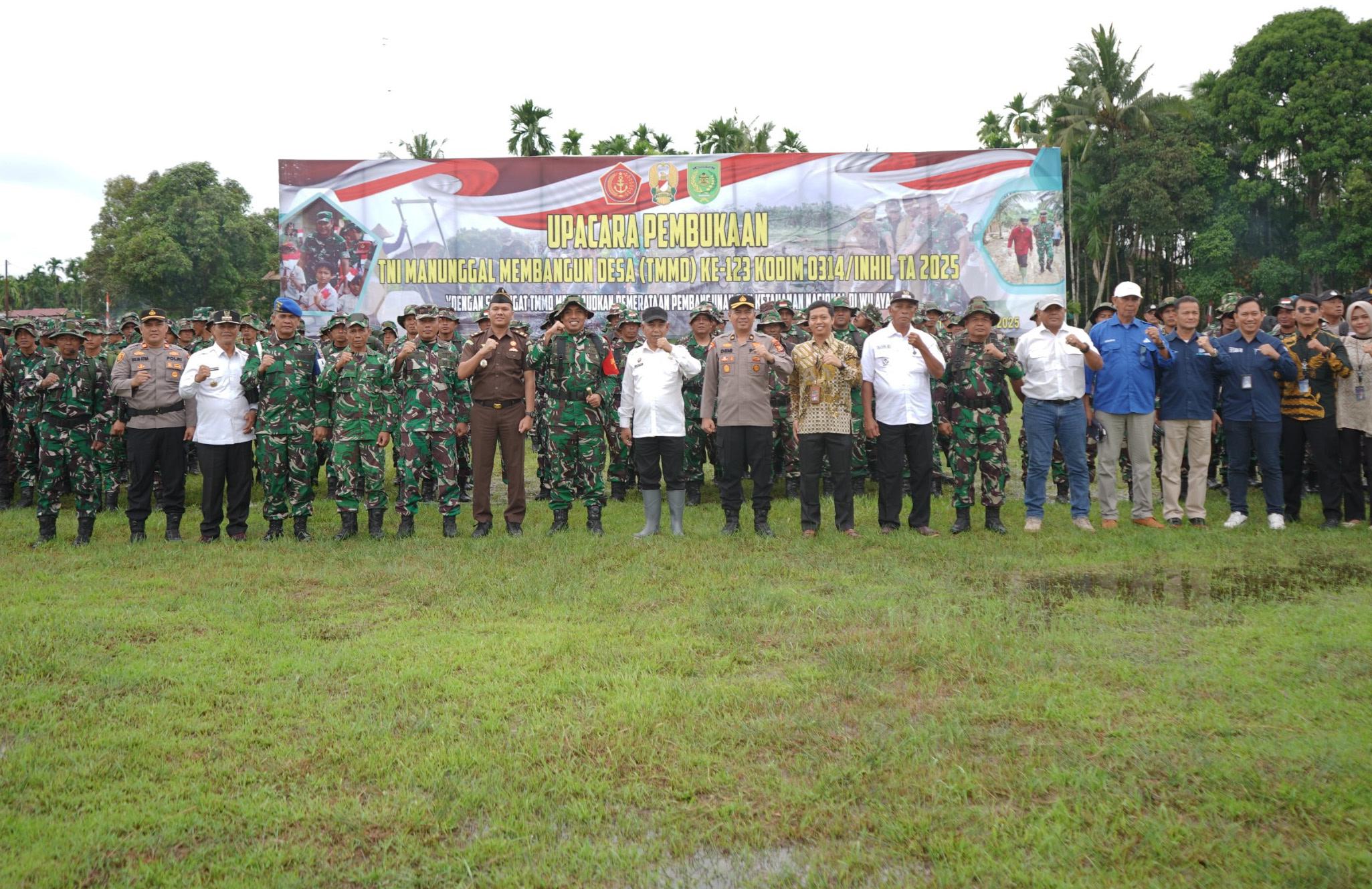 TEMBILAHAN – Komando Distrik Militer (Kodim) 0314/Indragiri Hilir (Inhil) menggelar pembukaan program TNI Manunggal Membangun Desa (TMMD) ke-123 di Desa Mumpa, Kecamatan Tempuling, Rabu (19/2). Program mengusung tema ‘Dengan Semangat TMMD, Mewujudkan Pemerataan Pembangunan dan Ketahanan Nasional di Wilayah’.