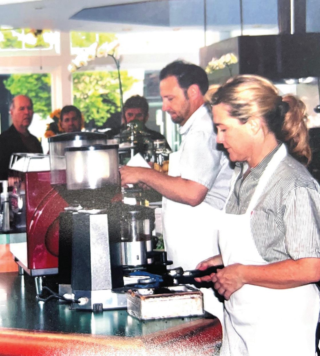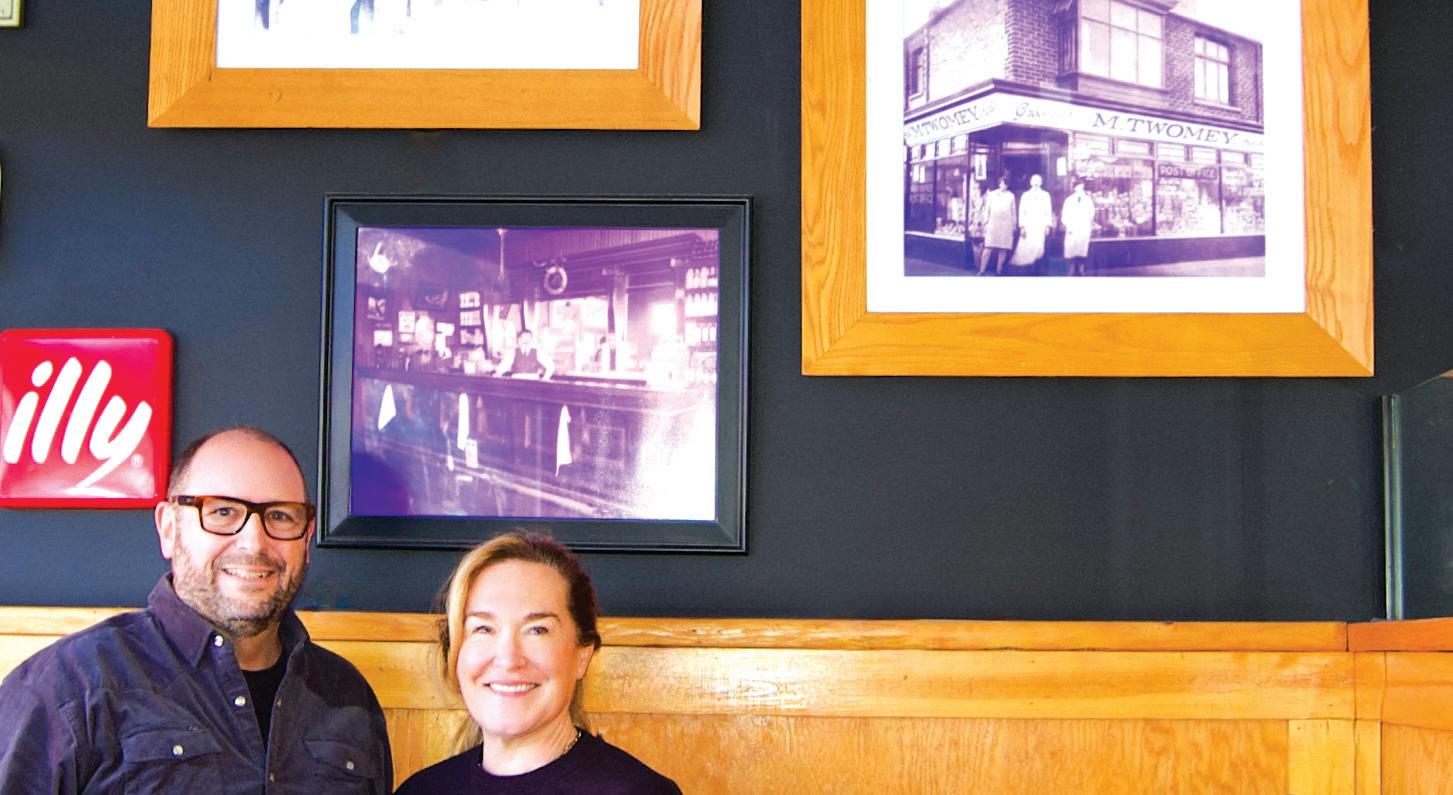 INTERIOR On a busy Saturday morning, Purple Onion owners Steve Angelo and Lisa Kilkenny stand in front of framed photographs from the Kilkenny family’s archives.