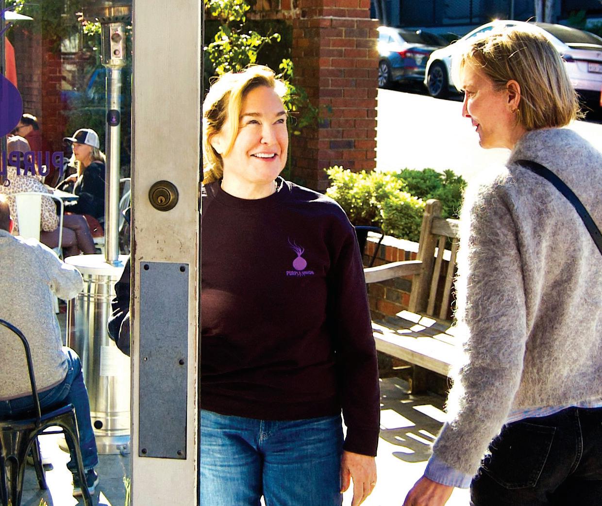 P1 - BATHED IN SUNSHINE Lisa Kilkenny holds the door for a customer. The restaurant she owns with Steve Angelo, the Purple Onion Cafe, is marking two decades in business, this spring.