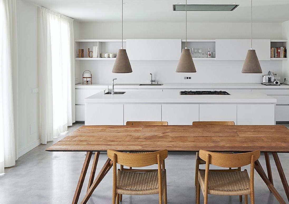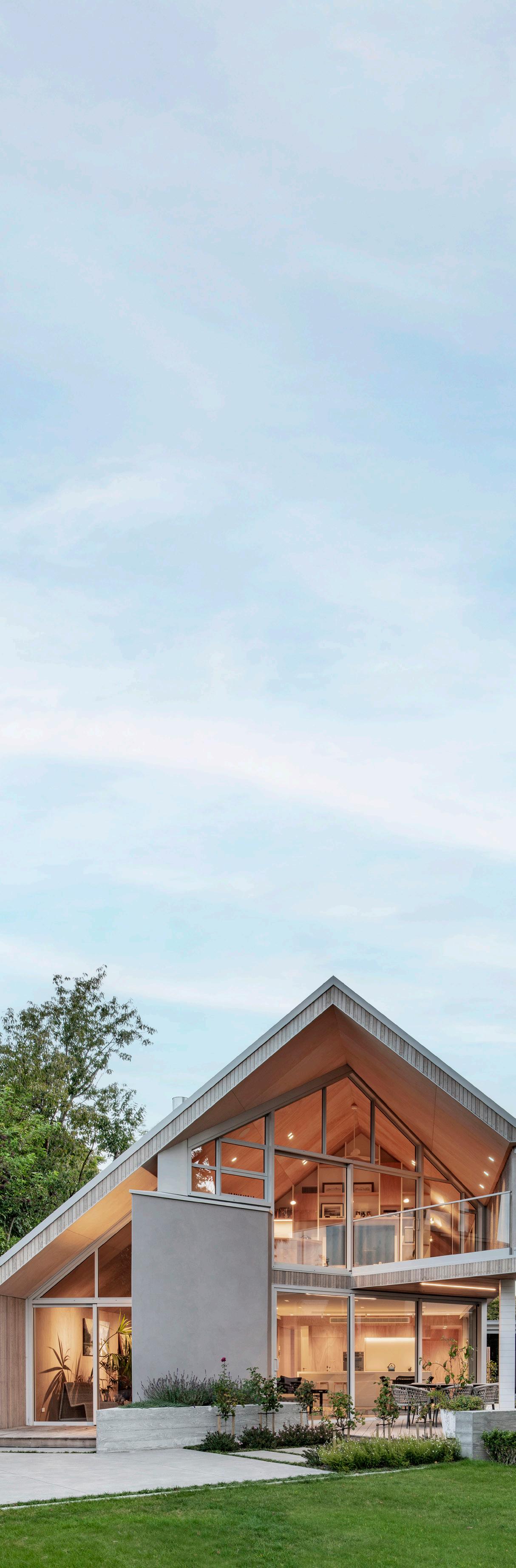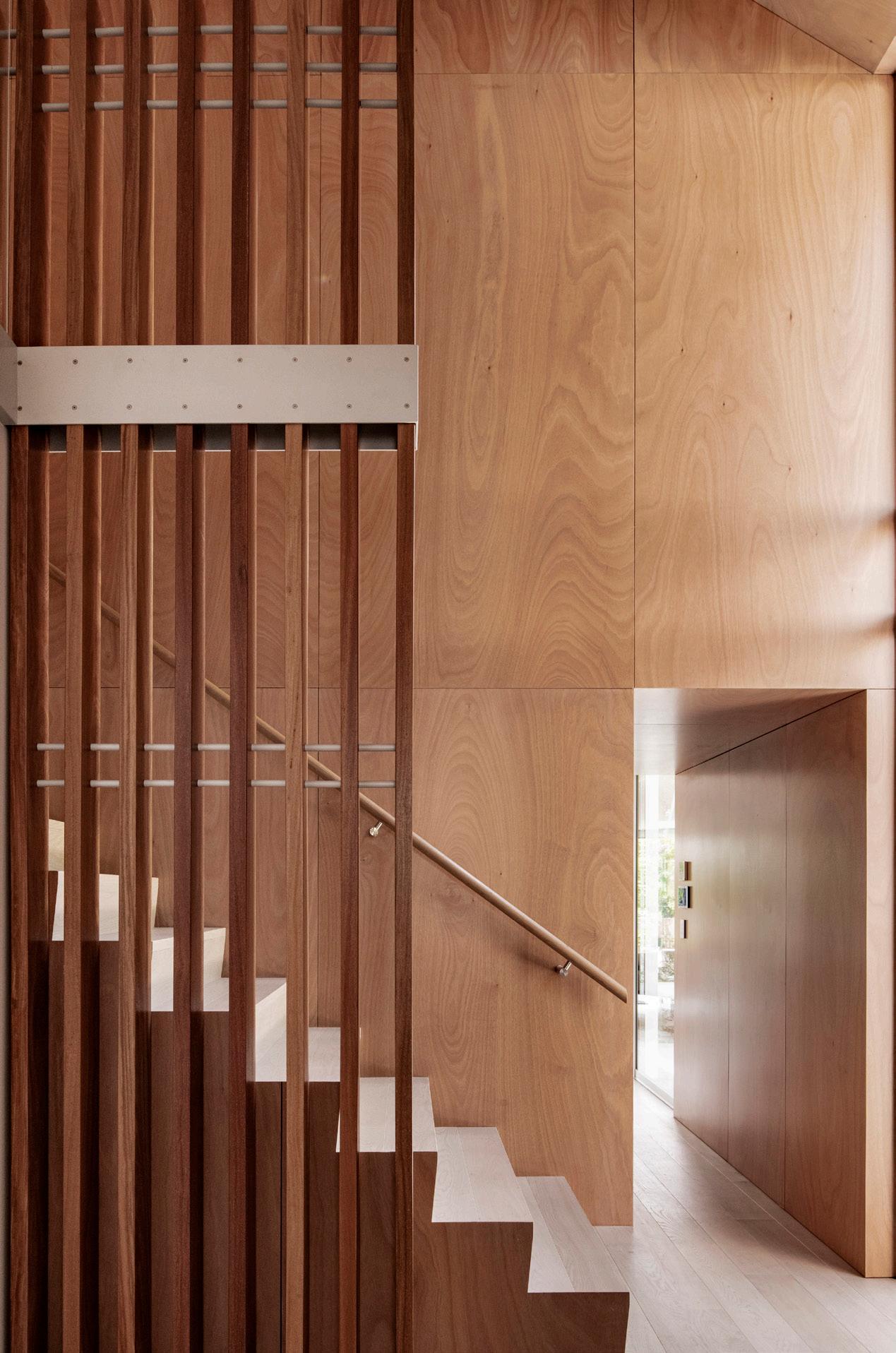 The brief was for an eco and sustainable home with e cient functioning. Thermally broken windows, and double walls provided extra sound and temperature insulation. The tight, narrow section for the 282sqm South Architects design meant the majority of work was onsite. The cedar-framed natural and white-painted exterior and Gaboon plywood interior required forward planning to implement the customised detailing.