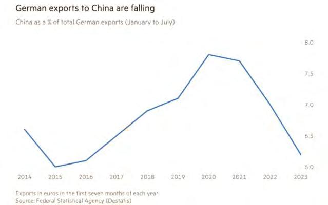 tăngtrưởngquantrọngtrongnhữngthậpkỷgầnđâycũng códấuhiệusụtgiảm.TheoFT,trong7thángđầunămnay, xuất khẩu của Đức sang thị trường Trung Quốc đã giảm 8,1%sovớicùngkỳnăm2022.